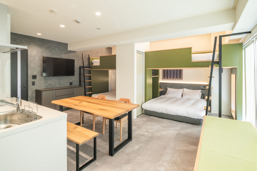 キッチン・乾燥機付き洗濯機・調理器具・100インチプロジェクターなど豪華な生活設備に加え、1フロア貸切の客室設計といった特徴を持った “暮らすように泊まる” ことが可能なアパートメント型ホテルです。