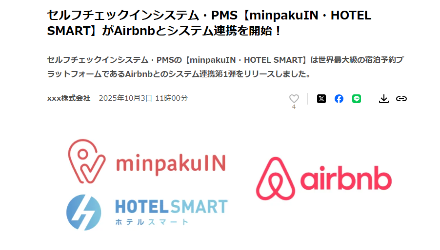 弊社が提供する『minpakuIN・HOTEL SMART』では国内PMS・チェックインシステム初となるAirbnbとの直接連携を可能にしております。